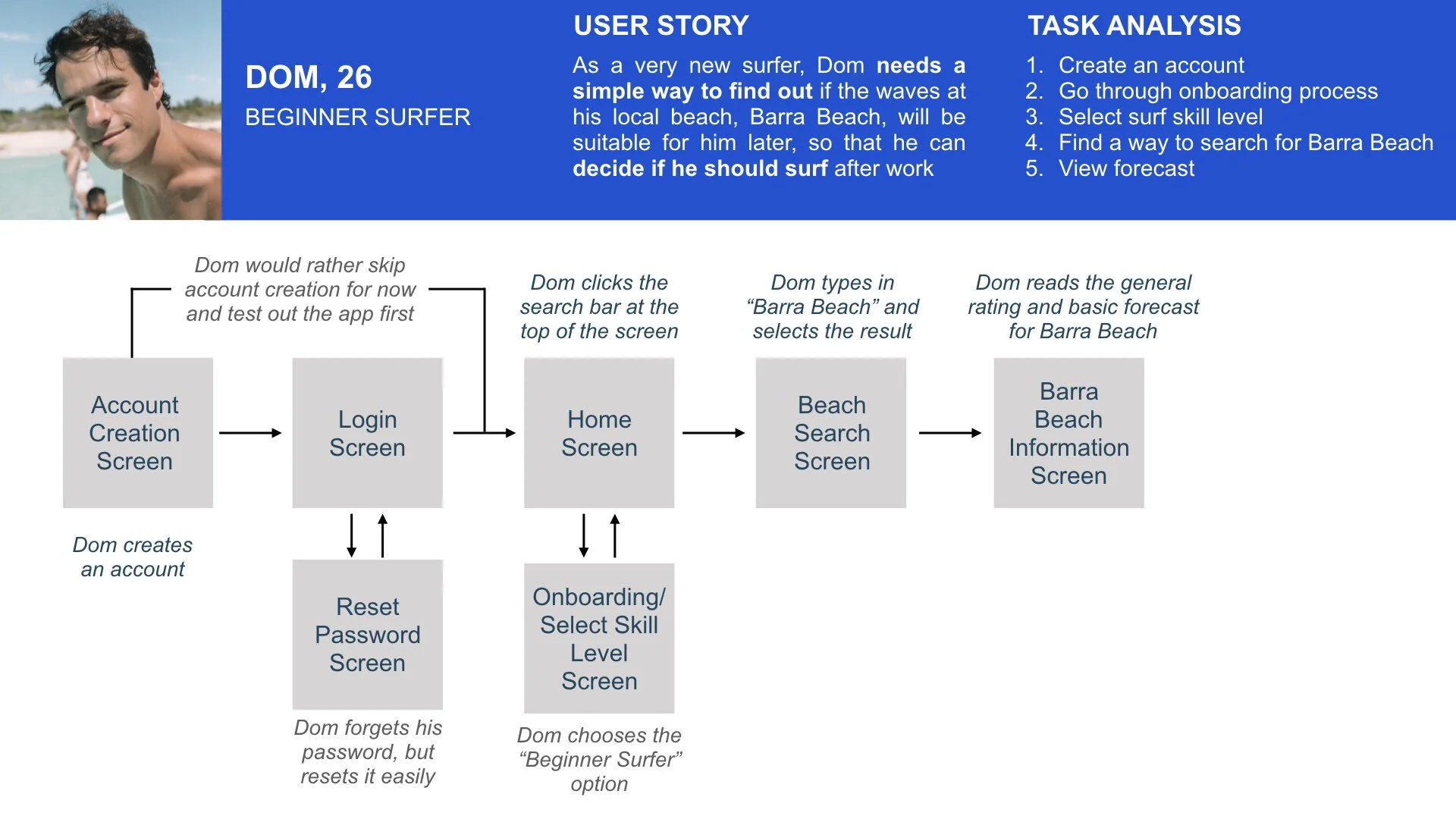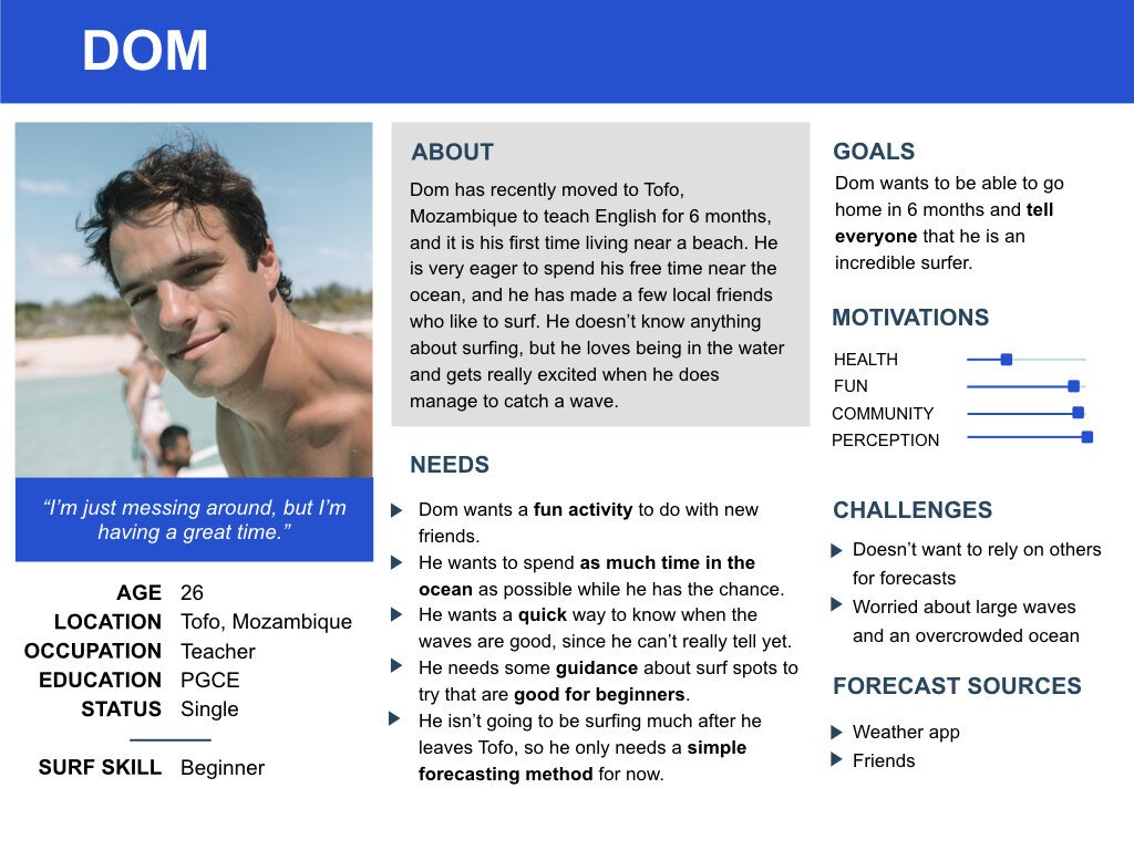 Since one of the key findings from my user research was the fact that users of varying surf skill levels have different needs, three user personas were created - namely for a beginner, intermediate and expert level surfer. I revisited these user personas often in order to remind myself of the needs and frustrations of my users, and to maintain a user-centric focus for the duration of the project.