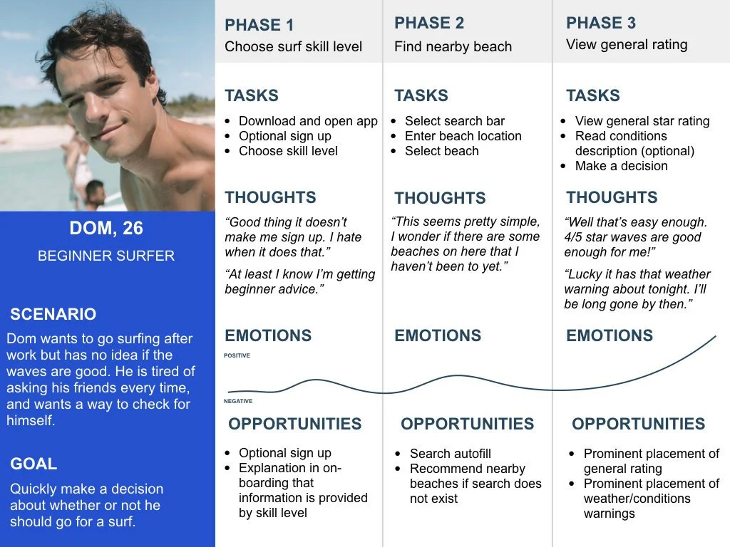 Finally, I created user stories that I could use to better understand the potential needs of surfers, to help decide on the functional requirements for Wave, and that I could refer back to throughout the project to keep focused.